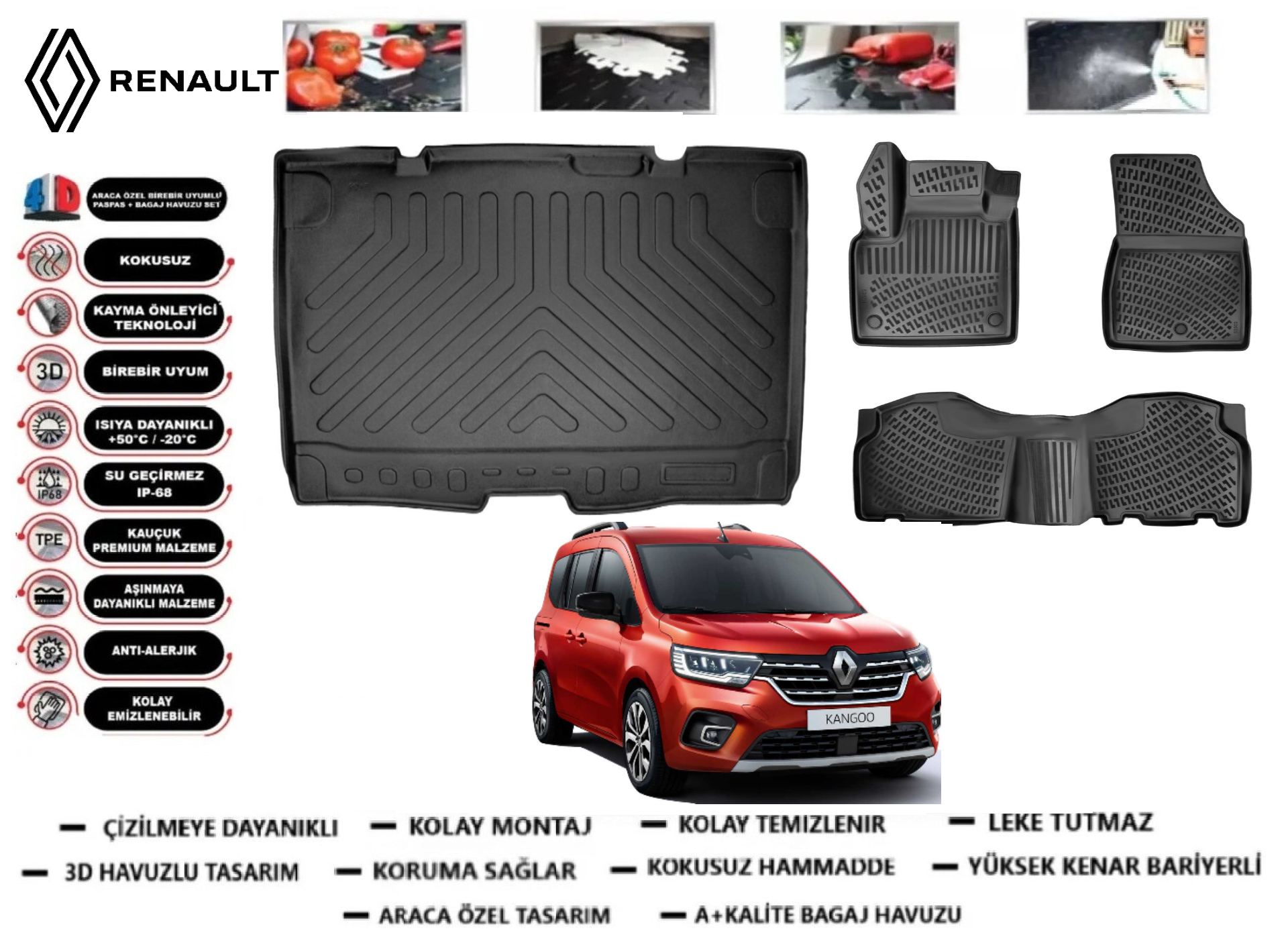 Renault Kango 2021 Sonrası 3D Bagaj Havuzu+3D Araca Özel Paspas Takımı