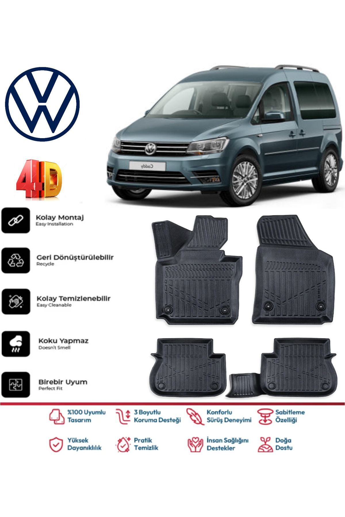 Volkswagen Caddy 2015-2020 4.5D Plus Havuzlu Siyah Paspas Takımı Yumuşak